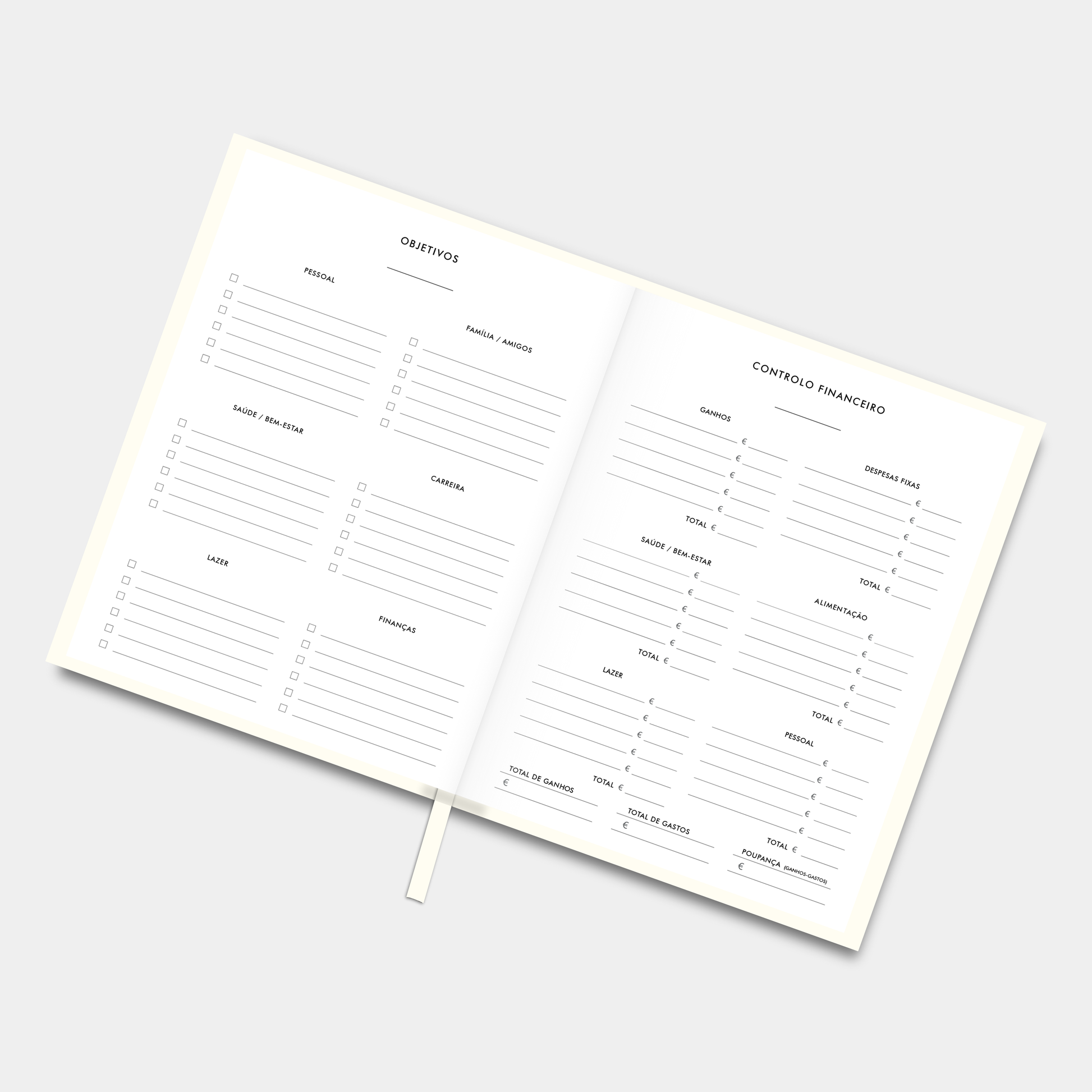 • Secções para controlo de hábitos, objetivos, finanças, bem-estar e objetivos mensais